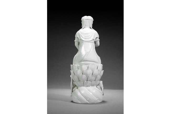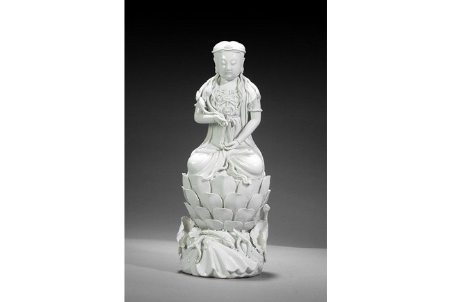 This exquisitely sculpted Blanc de Chine Guanyin, with her elegant body seated on a lotus base, her eye downcast and almond shaped face framed by a high chignon and pendant ears, her bare chest set off by a lotus pendant and tiered cape, minor lost and repairs commensurate with the age. H: 14 in ( 36 cm), W: 5 1/2 in ( 14 cm).