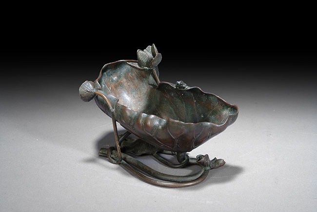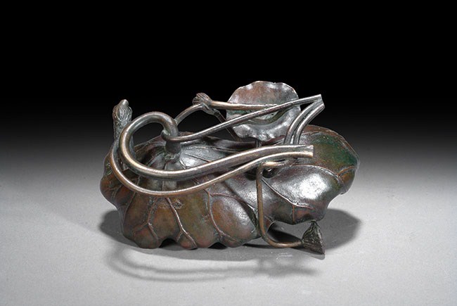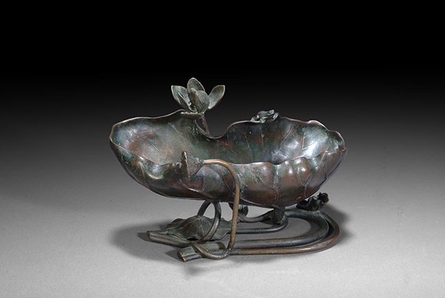 A large bronze brush washer, in the form of a lotus leaf, lotus flower, and a small frog. H: 5 1/4 in ( 13 cm), W: 8 in ( 20 cm).