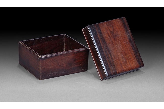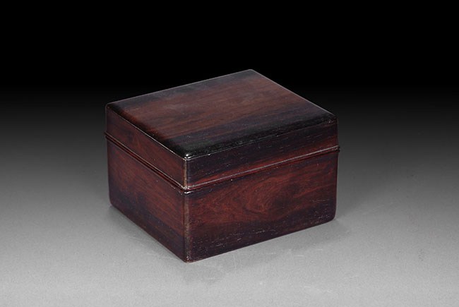 The box"s color is of dark red brown. This hardwood box is in very good condition, with artist mark in the bottom. H: 3 1/2 in (9cm), W: 5in (13cm).