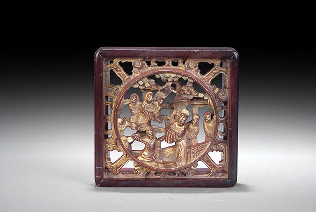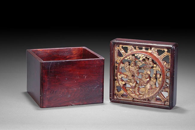 This carved hardwood box has multiple figures carved on the lid. H: 7 1/4 in (8 cm), W: 7 1/4 in ( 8 cm).