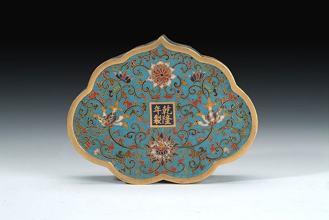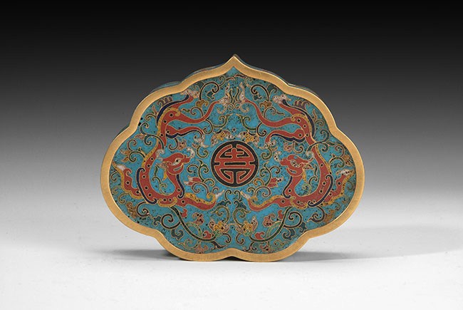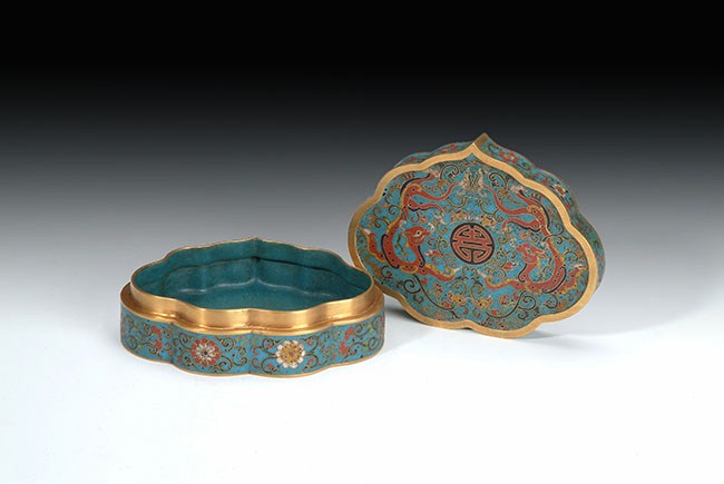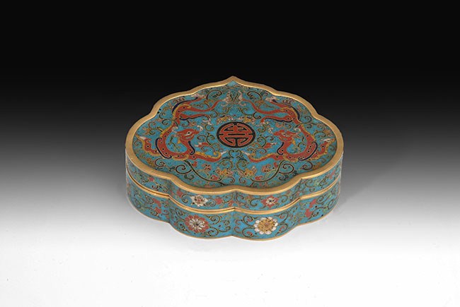 The box is of cloud shape, with dragons, flowers, clouds, and other patterns on the box. Mark of "QIANLONG" on the bottom. H: 1.5in (4cm), W: 4 3/4 in (10.5cm).