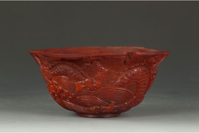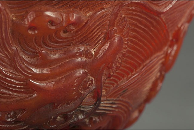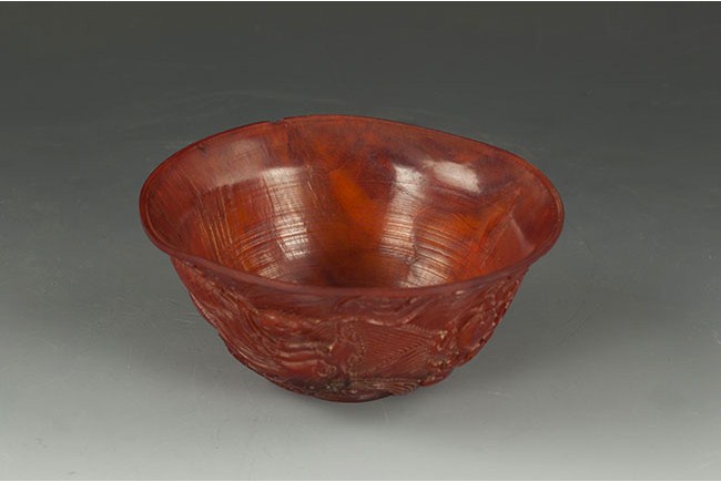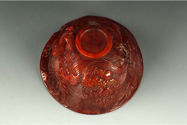 The well carved amber colored dragon bowl is decorated with ferocious dragons flying around in the sky. The inside of the bowl is perfectly smooth except for the few scratch marks. H: 2 1/4 in (6cm), D: 5in (13cm).