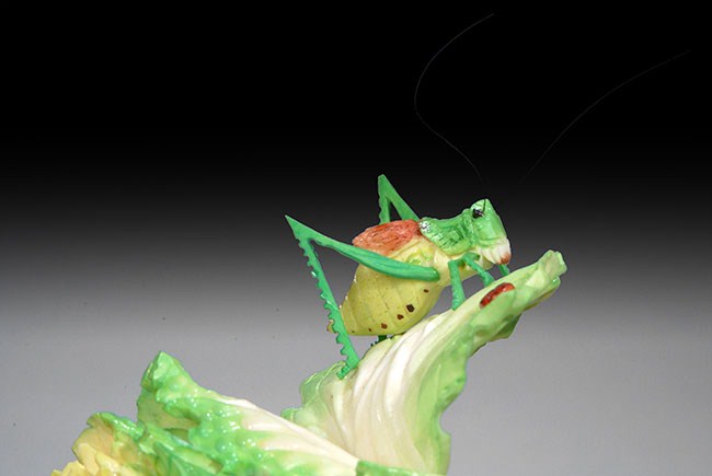 This remarkable elephant-bone-made figure was carved with a theme of grasshoppers on a cabbage surrounded by flowers, plants, and vegetables. L: 8 1/4 in (21cm).