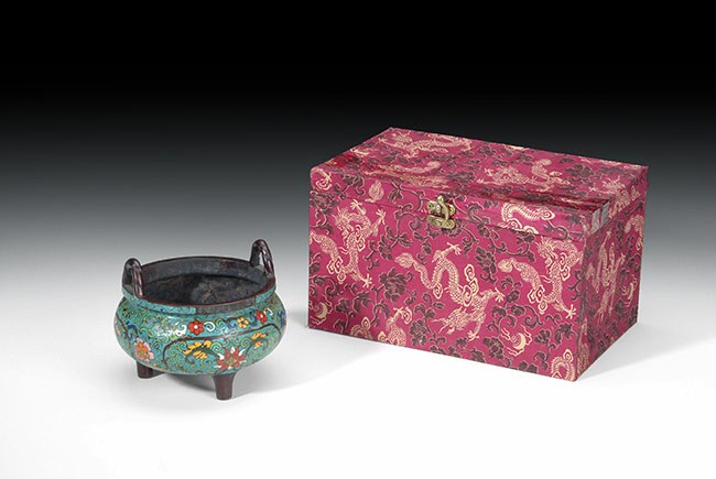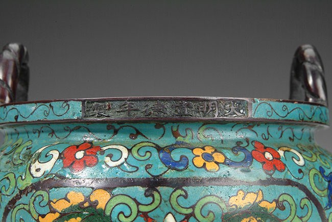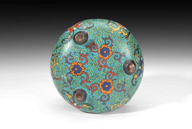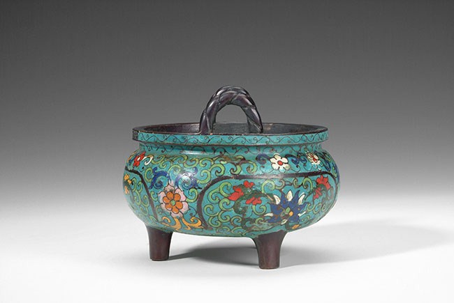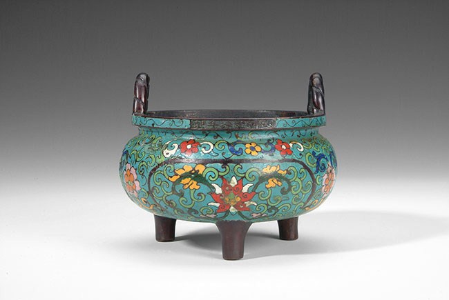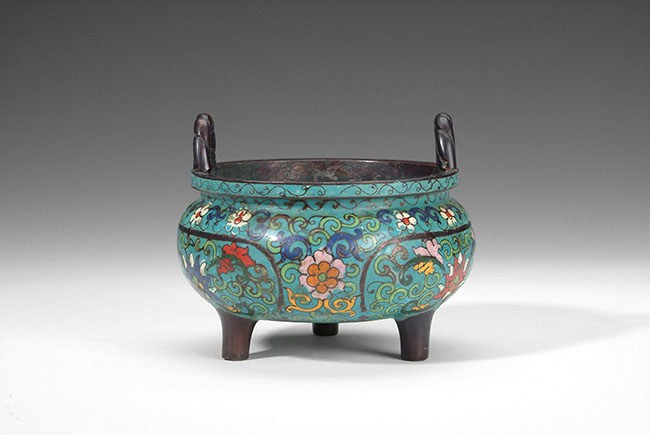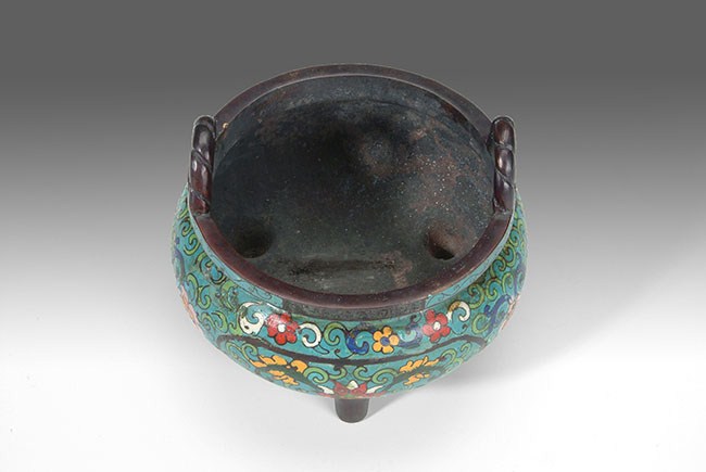 The enameled cloisonné censer is decorated with green vines and flowers of various colors. The censer stands firmly on top of three legs, with two handles at the top. H: 5 in (13 cm) W: 6 in (15.25 cm)