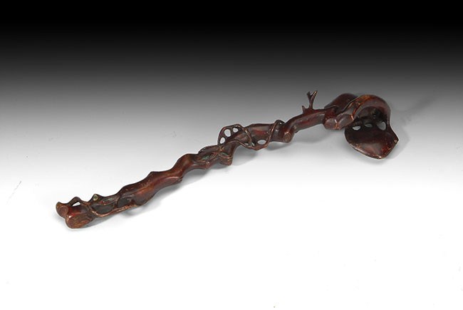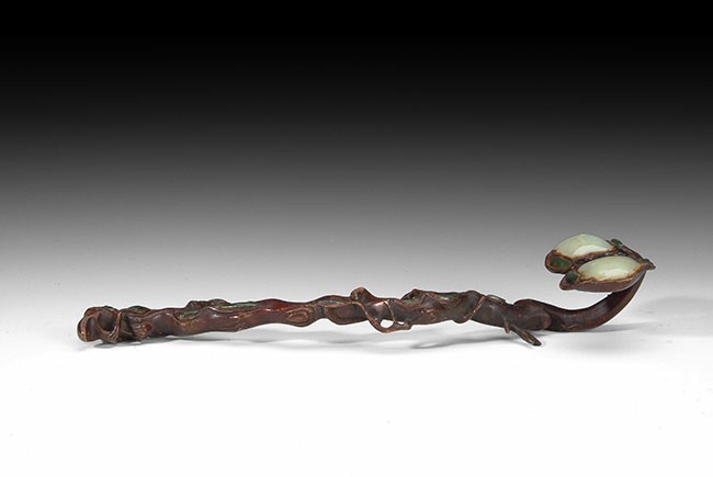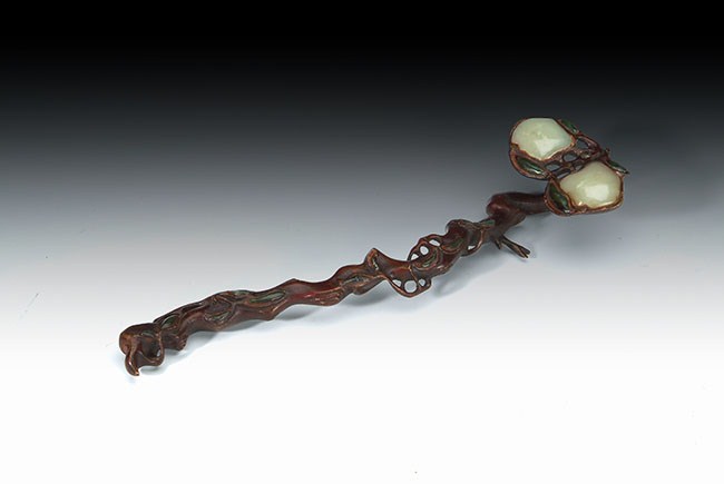 The well casted bronze Ruyi features Lingzhi and branch shape, with teardrop shaped jade scattered on the handle, and two larger jade pieces on top. L: 11 in (29 cm)