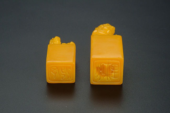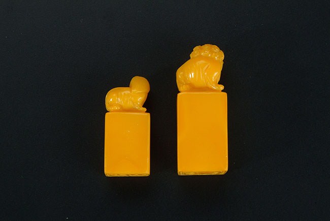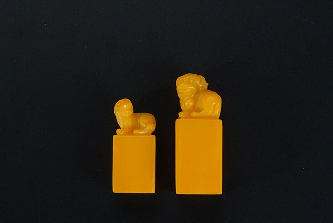 This Shoushan stone artist stamps have lions resting at the top. One stamp is a bit bigger than the other one. Larger H: 2 1/4 in (5.5 cm); Smaller : H: 1 3/4 in (4.2 cm)
