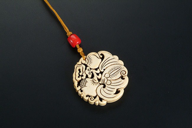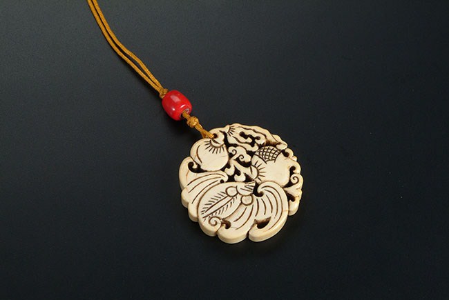 The ivory ornament is carved into a circular shape with depictions of bat, flowers, and fruits. Diameter : 2 1/4 in ( 5.5 cm)
