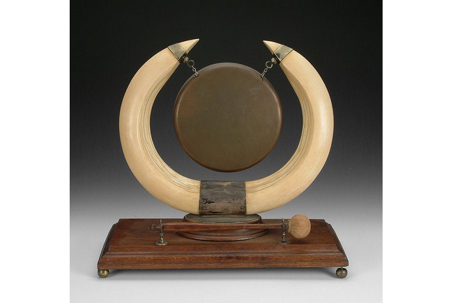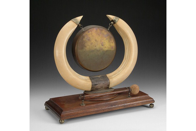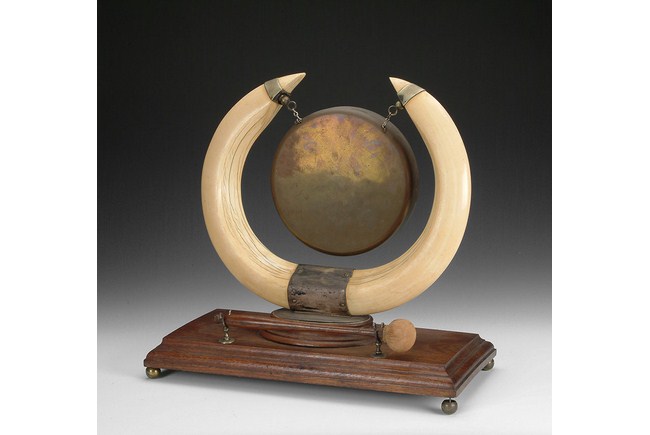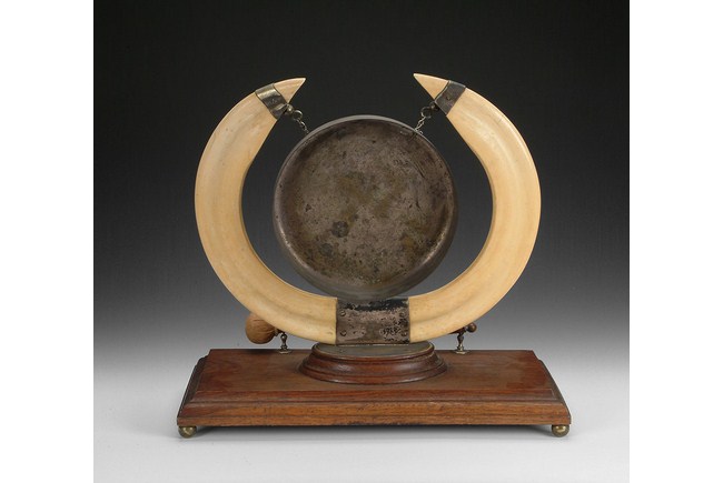 This gong is made of ivory from a walrus. H: 22 in (56cm), W: 21 1/2 in (55.5 cm), D: 10 1/4 in (26 cm)
