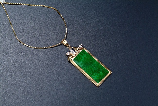 This lush green jade pendant is 1.15 inch x 0.5 inch Natural “A“ Jade and 0.39 carat Diamond and 18k Yellow gold