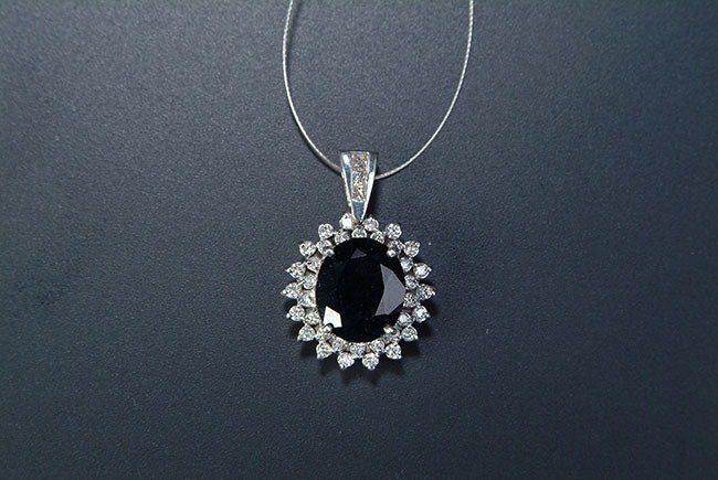The pendant center is 8.63 carat sapphire pendant and 14 k white gold and 2.5 carat diamond