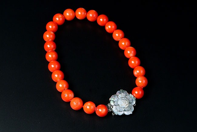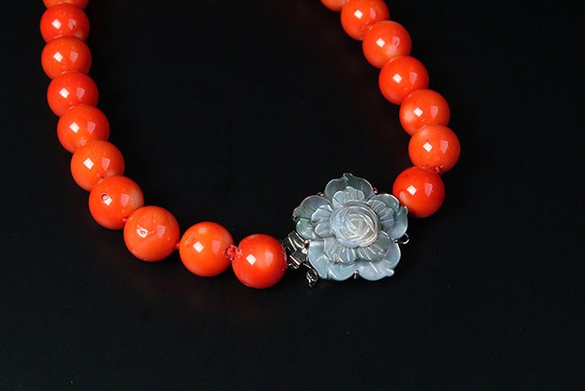 This natural coral necklace has 17.5mm to 16.5mm beads. length 17 3/4 inch (45 cm). Mother pearl clasp.
