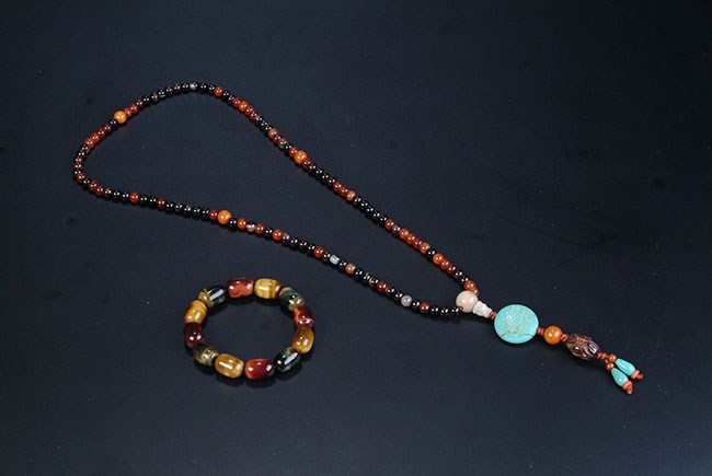 This beautifully stranded agate necklace is consist of one hundred and eight 0.5 cm sized beads with Buddhism style accessories. The Cats-Eyes Stone bracelet is consist of twelve 1.6 cm by 1.9 cm beads of the different color. Bead: 6mm to 25mm, L: 34 in (85 cm); Bead: 15 mm to 15mm, L: 8 in (20 cm);