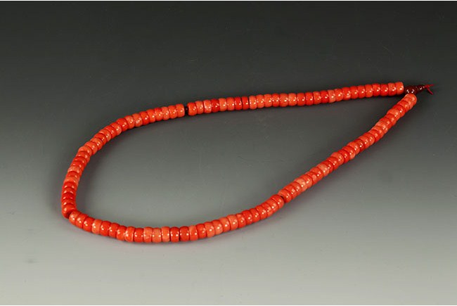 This beautiful coral necklace is strung with flattened ovoid shaped coral beads. L: 29 in ( 74 cm) Bead: 12 mm Weight: 170 g