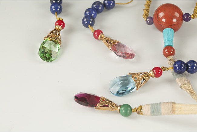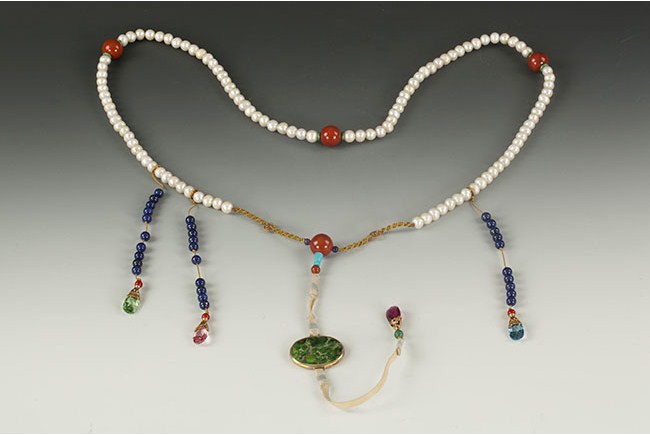 This well-strung strand of court beads is made from precious pearl and gemstones of different color. L: 51 in (129 cm), Pearl: 11mm