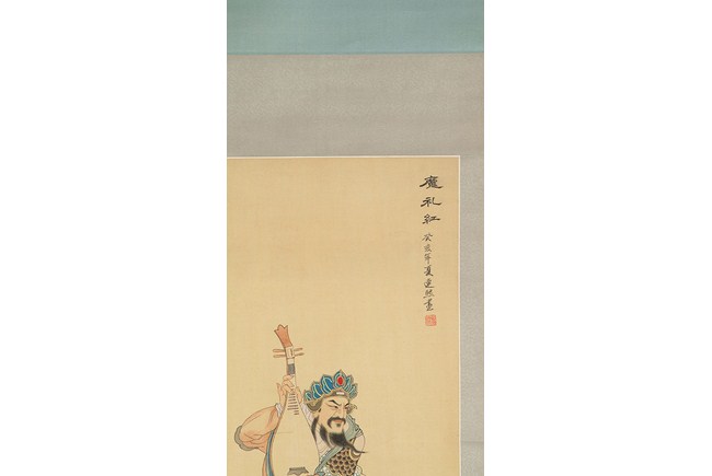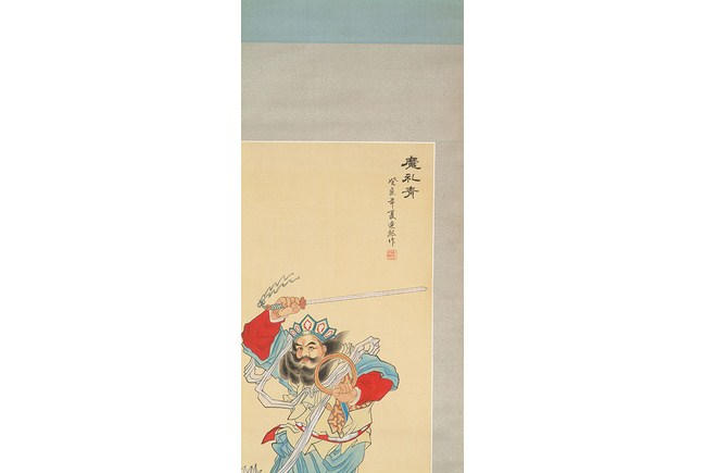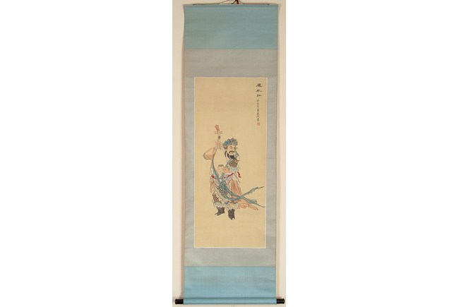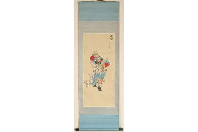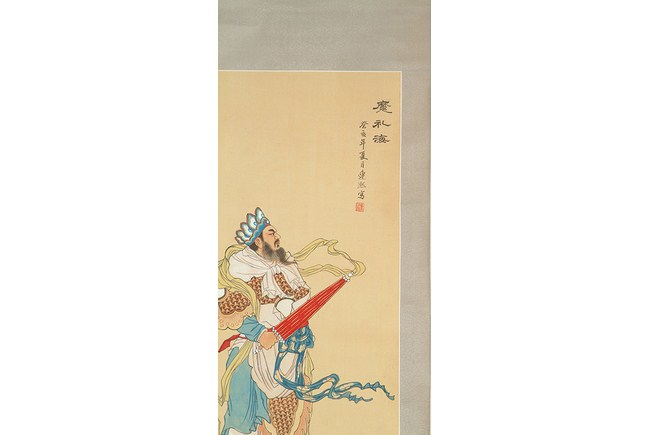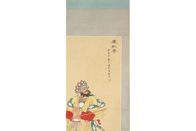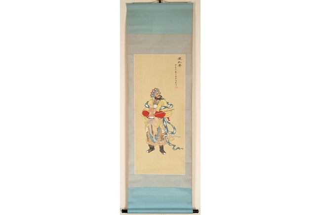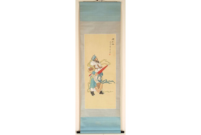 This set consists of four detailed paintings of fierce heavenly Kings each wielding their own personal item. The kings are equip and ready for action. L: 37 in (94 cm) , W: 15 1/2 in (39.5 cm)