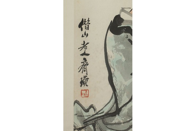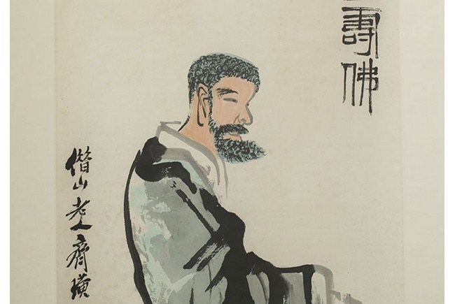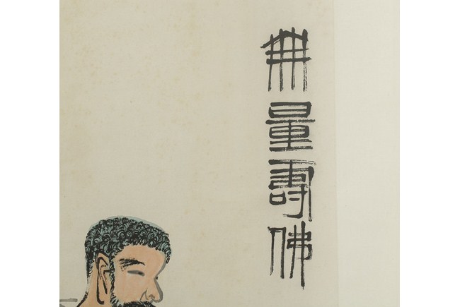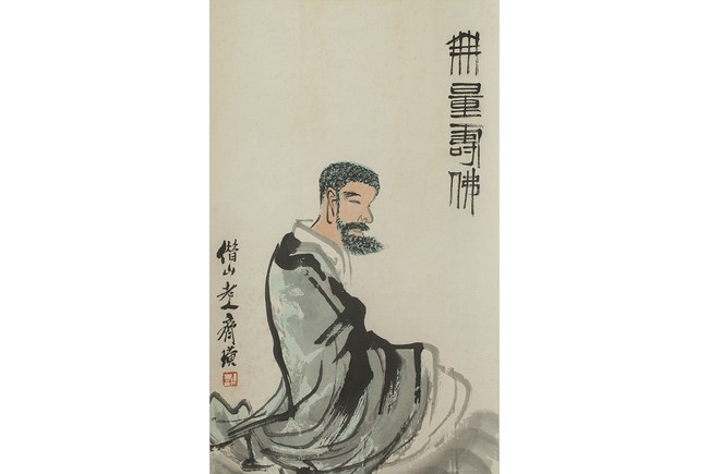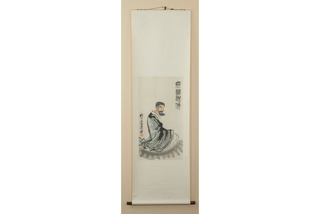 The painting depicts a seated Amitabha. Four Chinese characters on the top right corner, and artist mark on the left side. H: 35 in ( 89 cm), W: 18 1/2 in ( 47 cm).