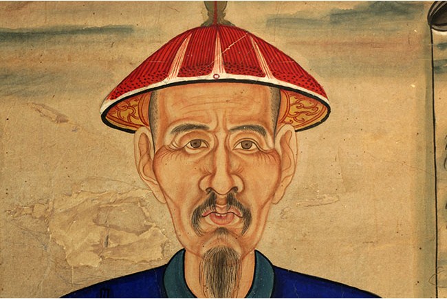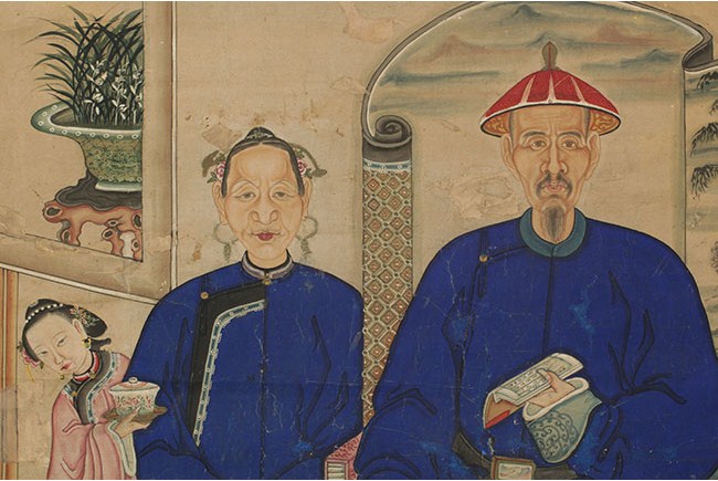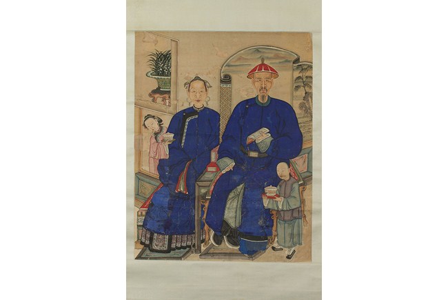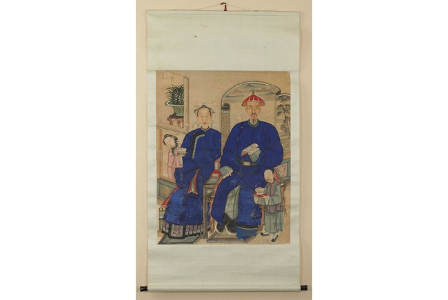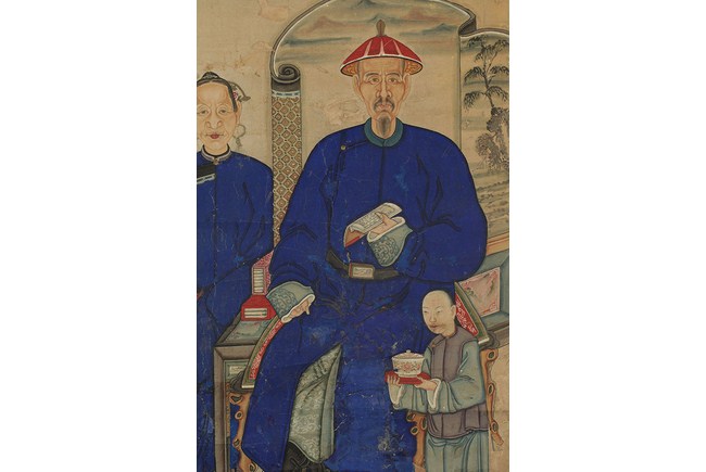 The family portrait depicts the official, his wife, and his two kids. The official and his wife are seated, while the two children are serving tea to them. H: 39 1/2 in ( 99 cm), W: 30 1/2 in (77 cm).