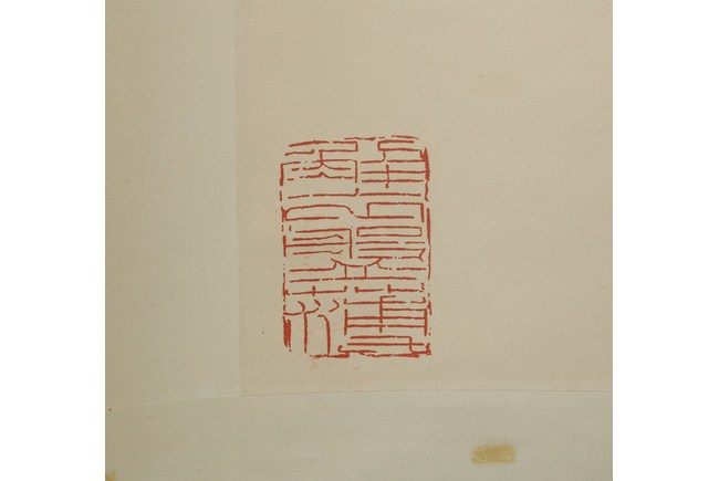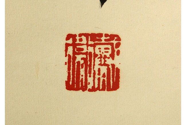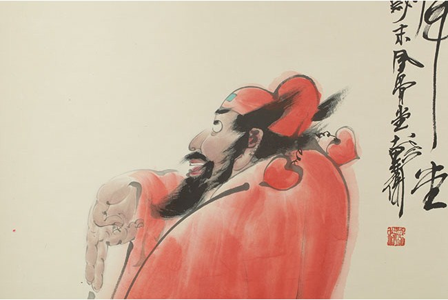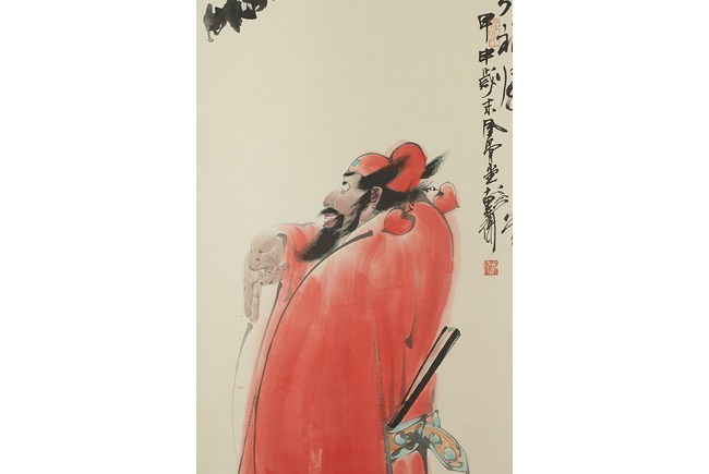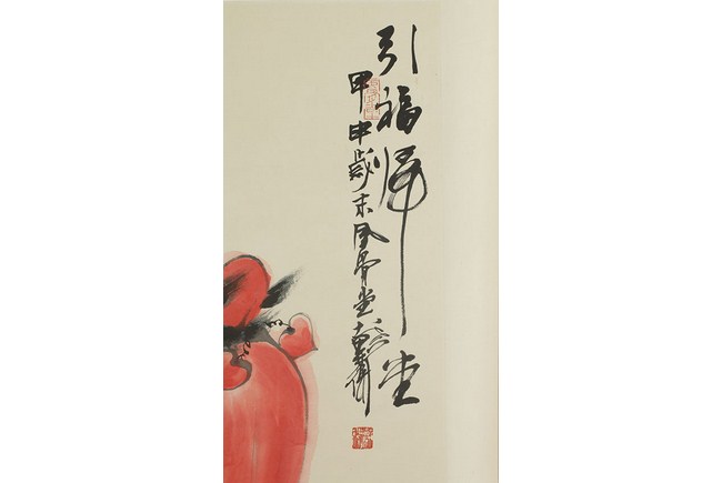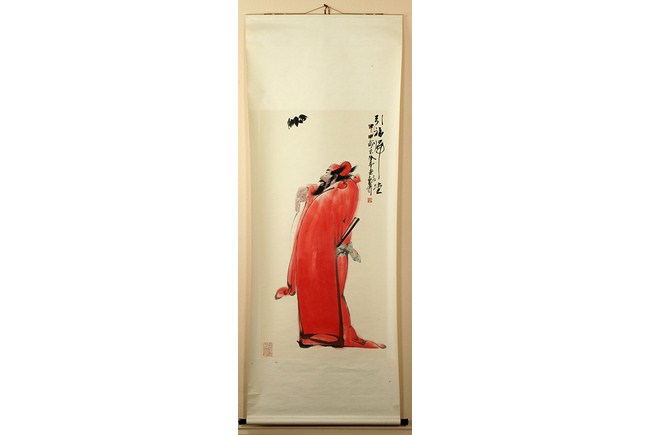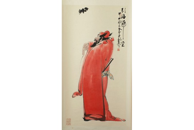 The painting depicts the man in red robe trying to attract a flying bat to come down, symbolizing incoming fortune. Chinese characters and mark on the right side. H: 54 in ( 137 cm), W: 27 in ( 68 cm).