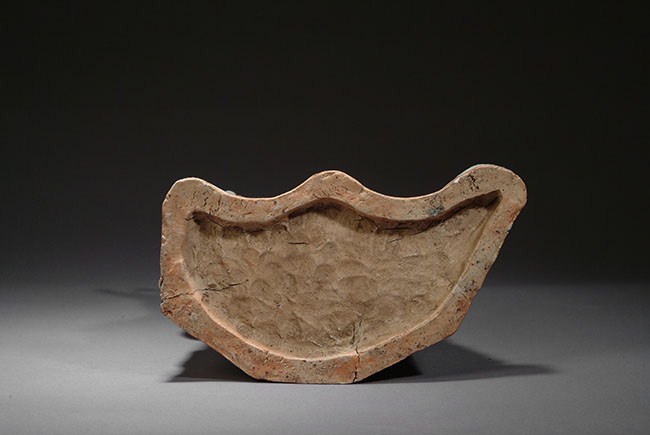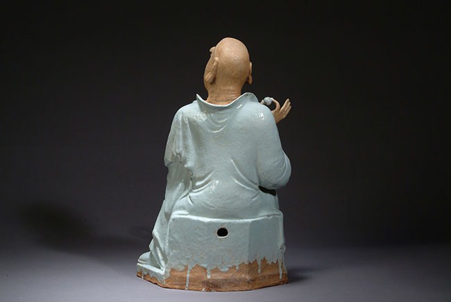 The ceramic Buddha is in a seated position, with one hand holding to his knee, and the other hand holding a Sarira. The robe is glazed, but exposed body parts were left unglazed. H: 15 1/2 in ( 39 cm), W: 8 1/4 in ( 21 cm).
