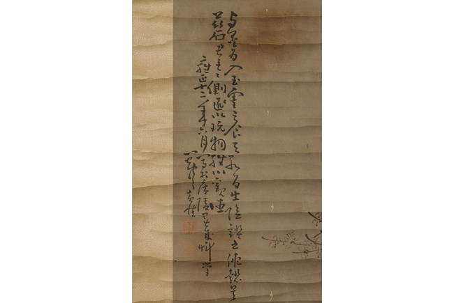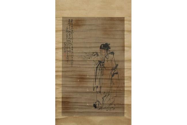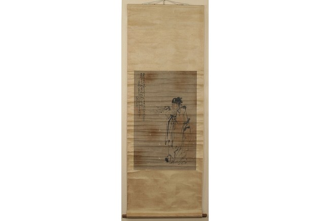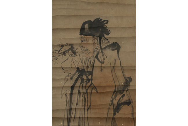 This ink painting portrays an old elderly figure holding a small tree in his hands. The tree is heavily tilted to the side. L: 27 in ( 94 cm), W: 23 1/2 in ( 60 cm).