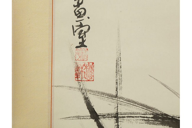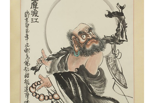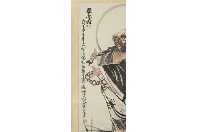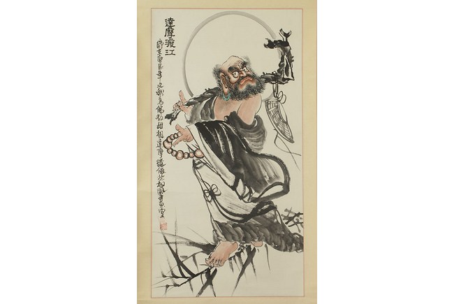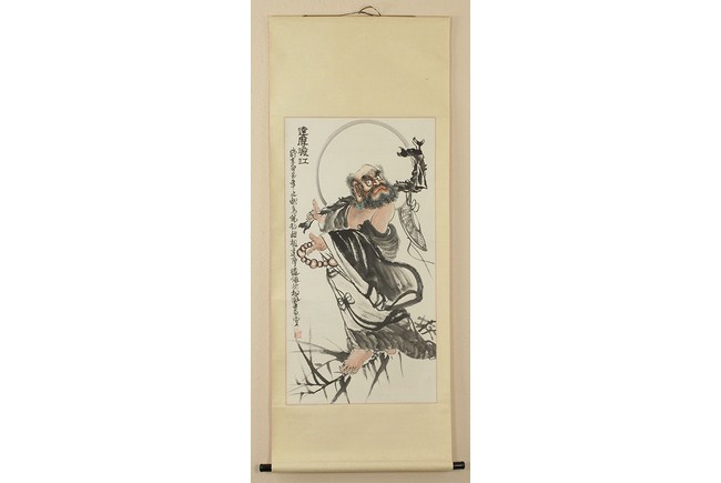 This painting portrays a Bodhidharma attempting to cross a river. He holds beads in one hand and a cane in the other. Artist mark on the left side. L: 37 1/2 in ( 95.5 cm), W: 19 3/4 in ( 50 cm).