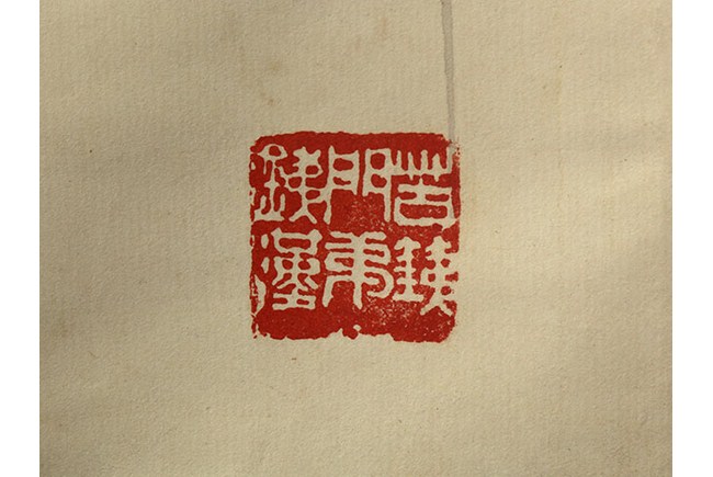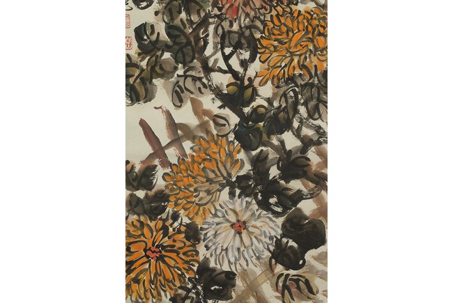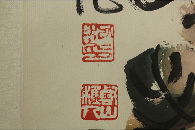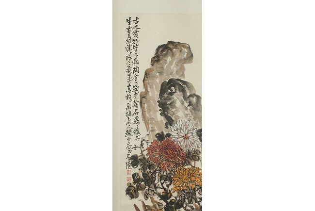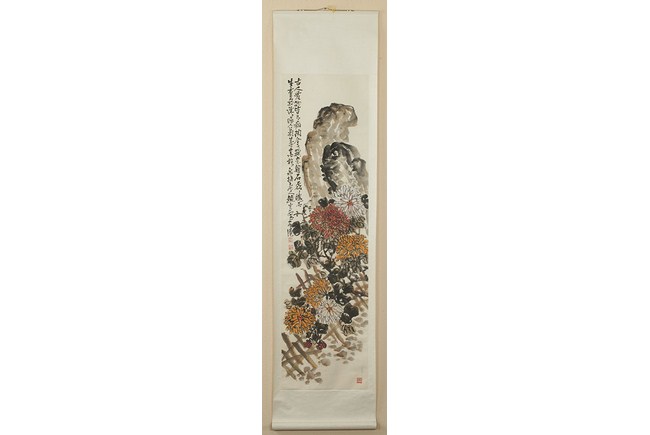 This beautifully painted painting consist of full bloom flowers around a mighty mountain. A well-written Chinese poem is inked on the left side, along with the artist mark. L: 58 in ( 147.5 cm),W: 16 in ( 40.5 cm).
