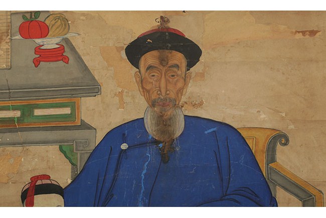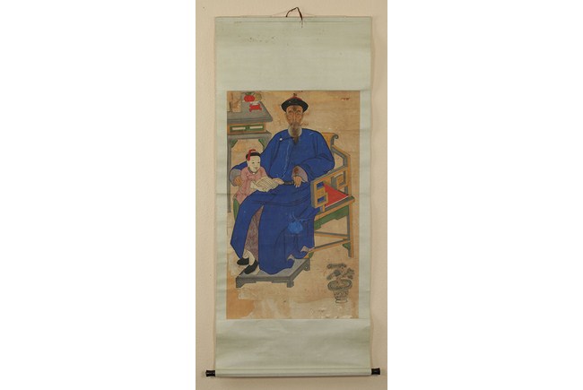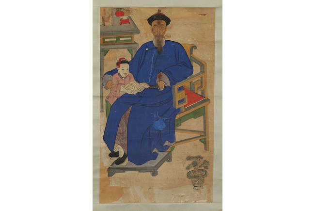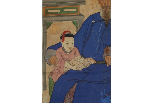 This painting portrays a Qing Dynasty official seated on his chair with a little boy at his side. L: 42 1/2 in ( 108 cm), W: 24 7/8 in ( 63 cm).