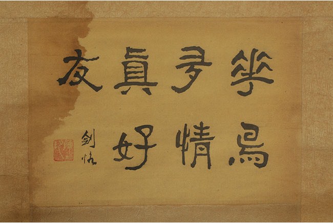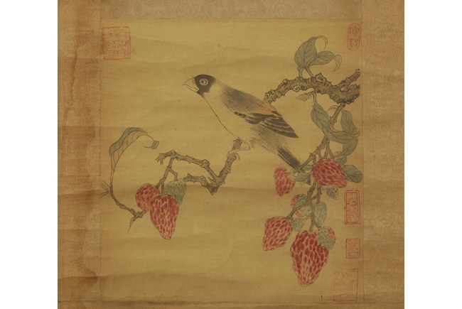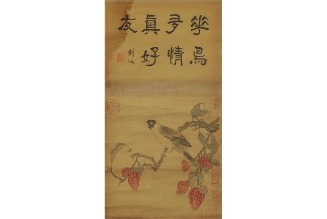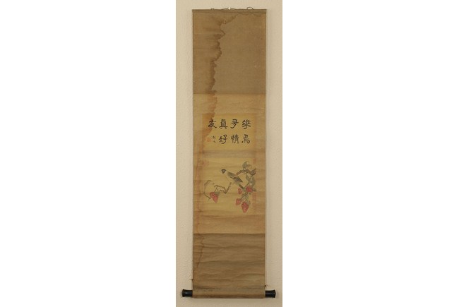 This set of painting consist of a bird resting on a branch with flowers. Chinese words and artist stamp written on the top. H: 17 1/4 in (44 cm), W: 9 in (20 cm)