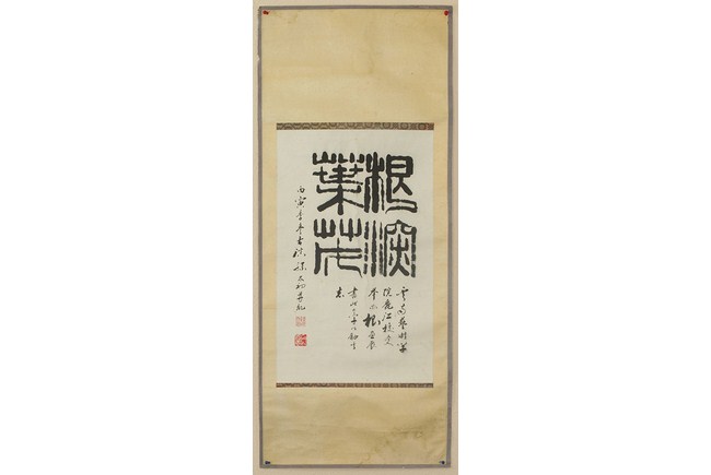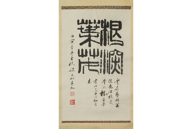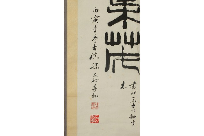 This Chinese calligraphy painting is inscribed with a giant characters in the center and a small poem on the bottom and side. Artist mark on the bottom left corner. H: 27 in ( 69 cm), W: 16 in ( 46 cm).