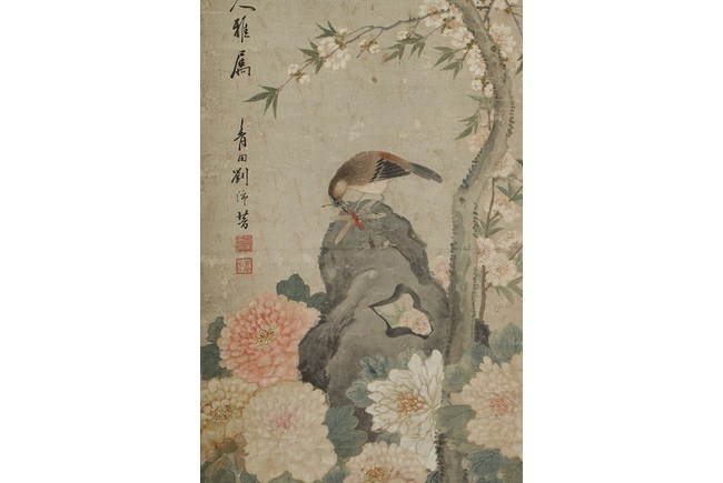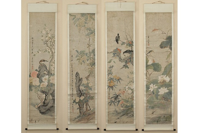 A SET OF FOUR HANGING SCROLLS A set of four (4) hanging scroll, ink and color on paper, depicting flowers and insects, by Qing artist Liu Lin-Fong.