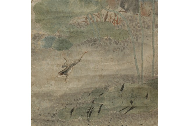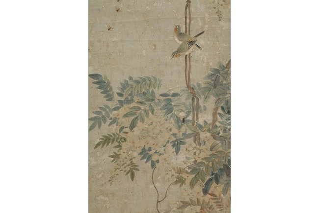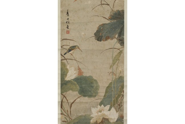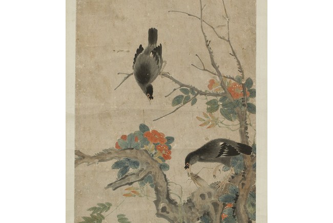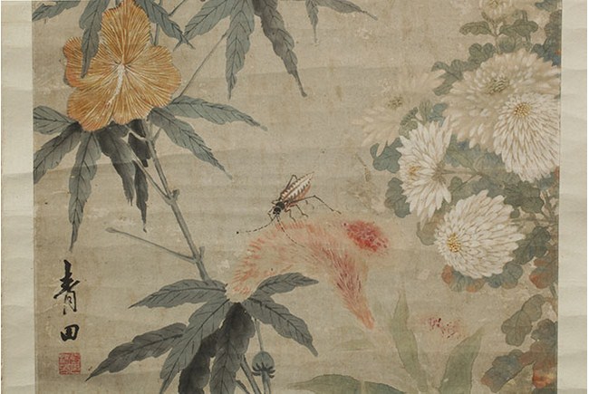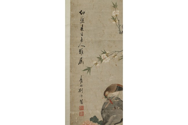 The scrolls are made with ink and color on paper, depicting flowers and insects, by Qing artist Liu Lin-Fong. H: 67 3/4 in ( 171 cm), W: 15 3/4 in ( 40 cm)