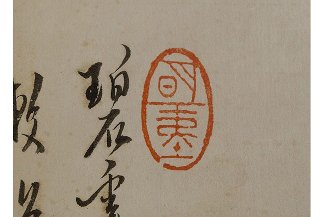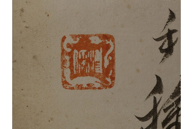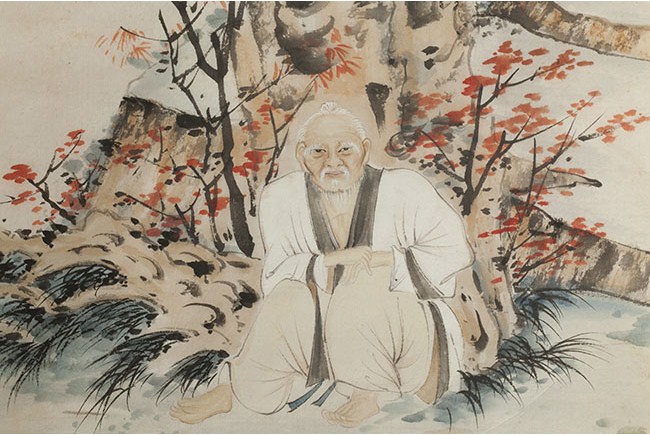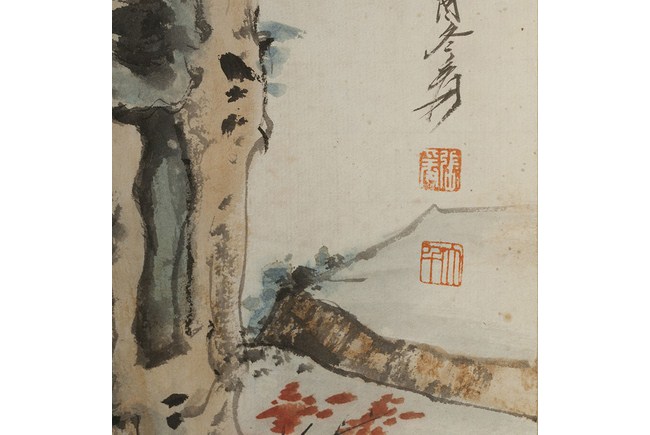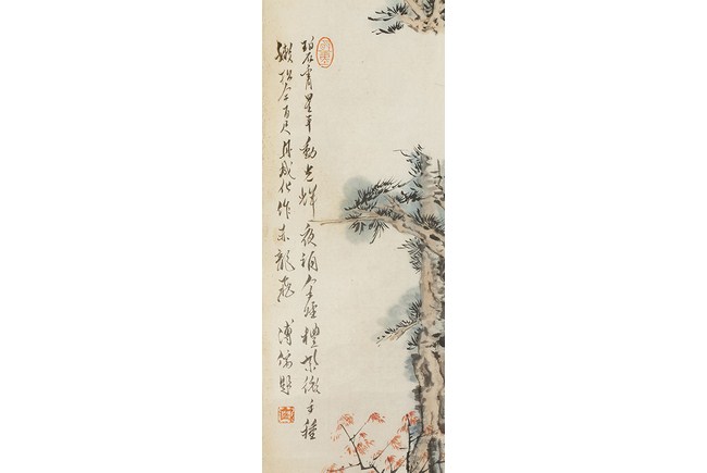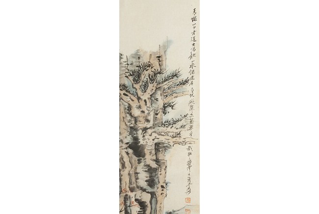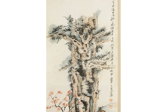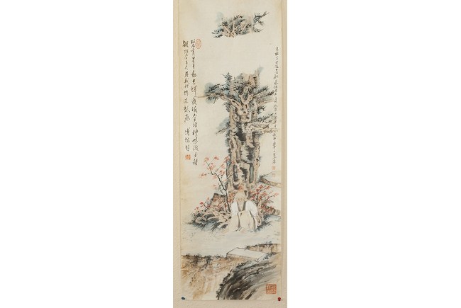 This detailed painting depicts a tree that reaches up to the sky with an elderly man resting in front of it. A small Chinese poem is written on the side and an artist mark is stamped next to it. L: 45 in (114 cm) W: 13 3/4 in ( 35 cm)