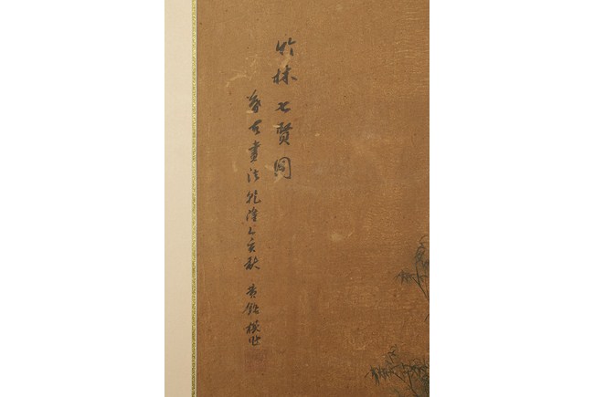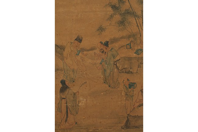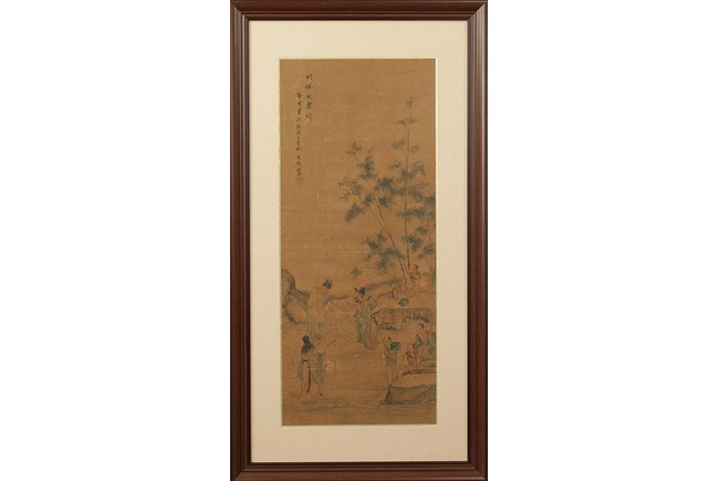 The painting depicts seven scholars relaxing in a bamboo garden, with a young attendant serving them. Artist mark on the top left. W: 16 1/2 in (42 cm), H: 38 3/4 in (98.5 cm)