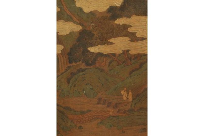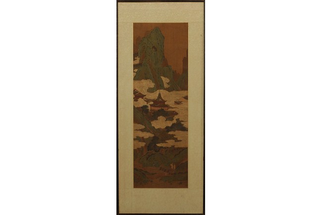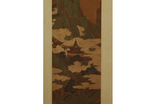 The painting depicts a tall mountain, with pavilions barely above the floating clouds. Two monks are conversing at the bottom of the mountain, near a bridge. W: 13 3/4 in (35 cm), H: 41 1/4 in (105 cm)