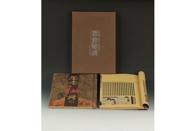 This two volume Chinese erotic book is string stitched similar to older books. The book shows various Chinese erotic poems and paintings. W: 11 1/4 in (29 cm), L: 16 in (41 cm)