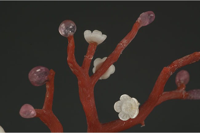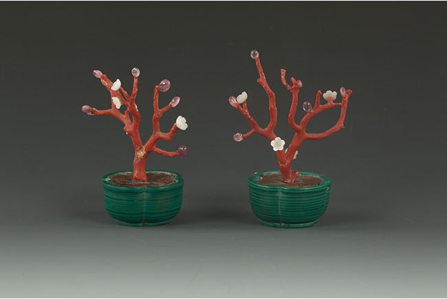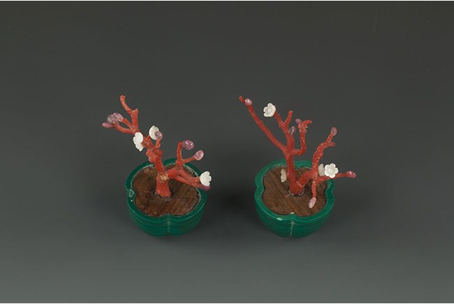 This Pair of planters are made of coral and inlaid with gems that form flower buds and petals. H: 4 in (10 cm )
