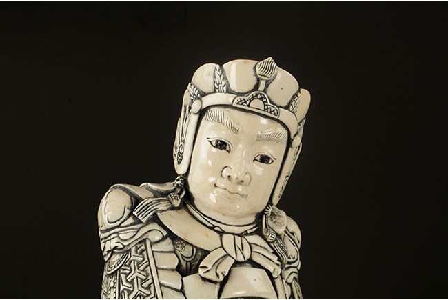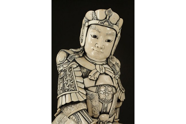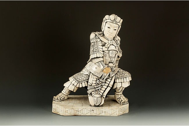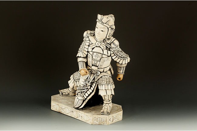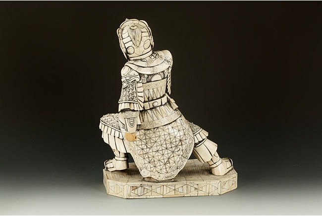 The figure depicts a young and fierce warrior in a ready posture. He wears full body armor, with Taotie masks on the shoulder and thigh guards. Made of ivory pieces. H: 17 1/2 in (44.5 cm) L: 14 in (36 cm)