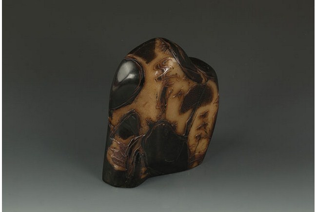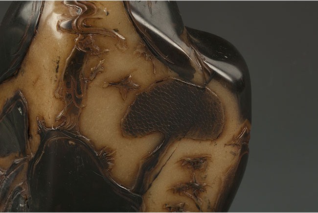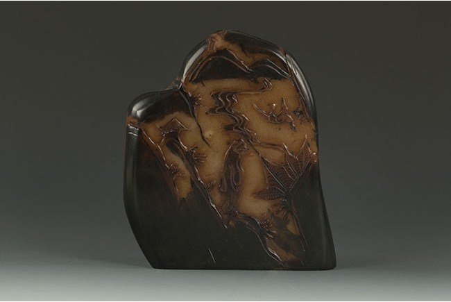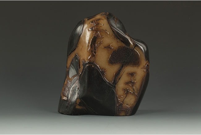 This well-carved table ornament is made in the form of a mountain, and it has carvings of landscape on both sides. H: 7 1/4 in (18 cm) W: 6 3/4 in (17 cm)