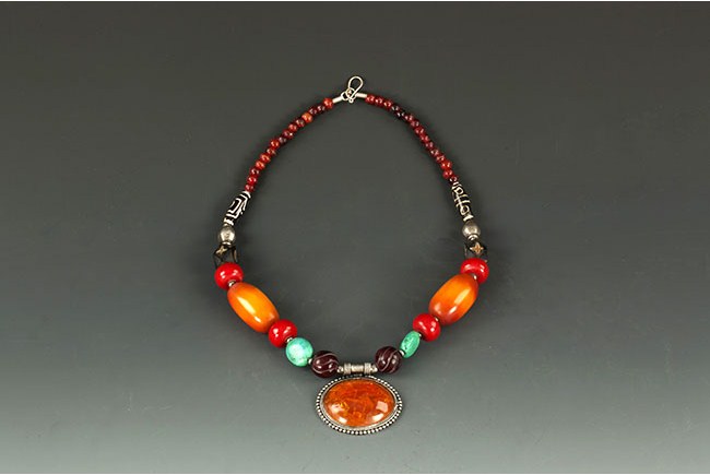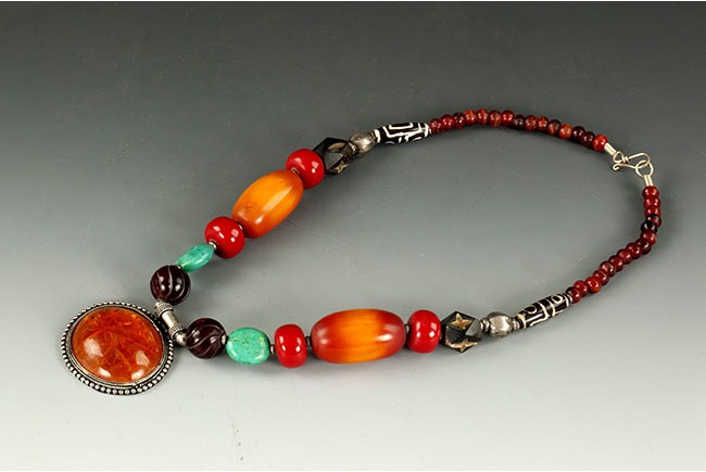 The necklace was stringed with many different materials, including agate, amber, coral, turquoise, and others. L: 13 in ( 33 cm)