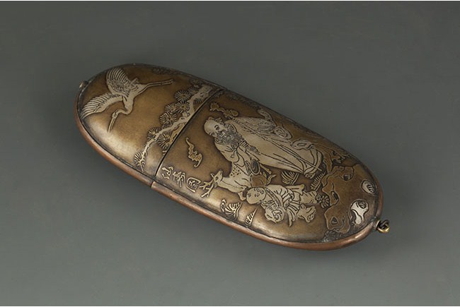 The eye glasses holder has silver enamel, depicting Chinese cranes, Shou Lao, and other symbols of fortune. H: 5 1/2 in (14 cm), W: 2 1/4 in (5.5cm)