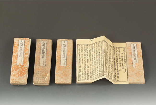 The Mahaprajnaparamita Sutra was translated to Chinese, each pamphlet can expand to a long scroll. Some damaged pages. H: 10 3/4 in (27.5cm), W:3 1/4 in (8.25cm)