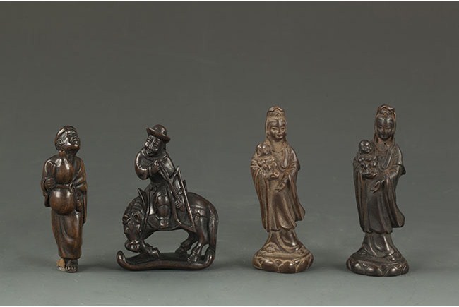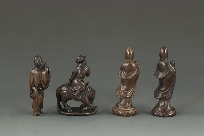 Two figures depict Guanyin with a baby. One figure depicts a Chinese rider with bow and arrow in hand. The last figure depicts a man with a fan and a huge gourd; half foot missing. H: 3 in (7.5 cm)