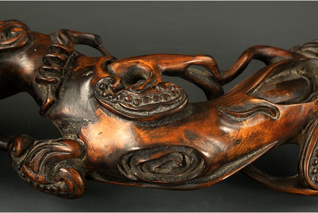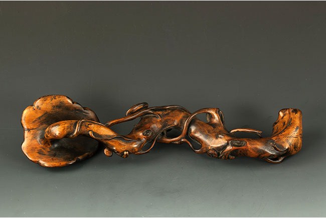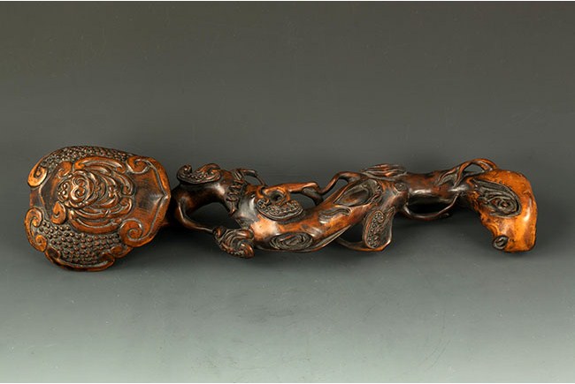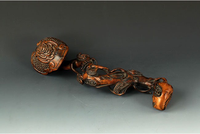 The Ruyi is made from black walnut wood, with shape similar to Lingzhi. Naturalistically carved. Some minor cracks and damage. L: 13 1/2 in (34.25cm)