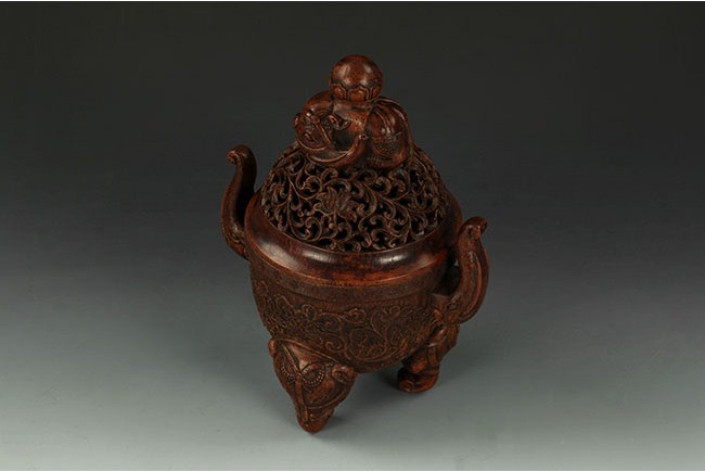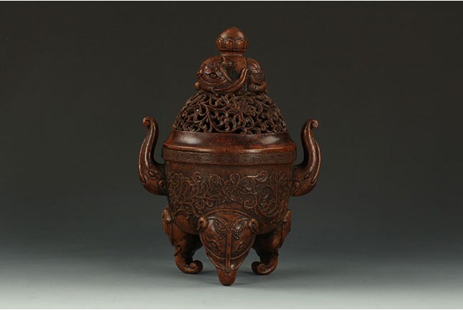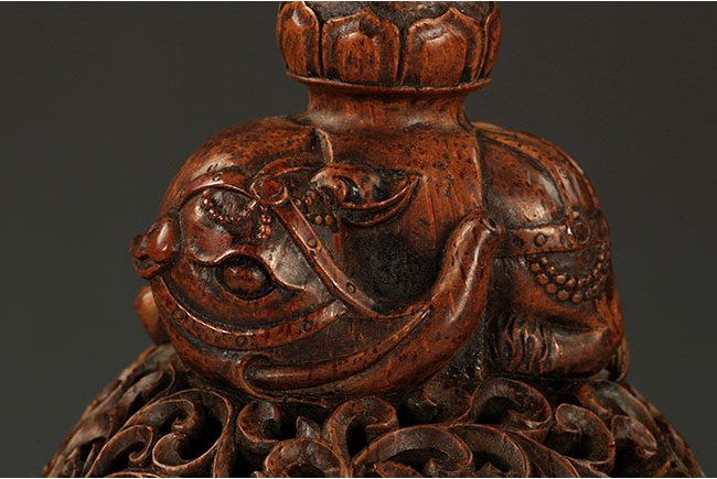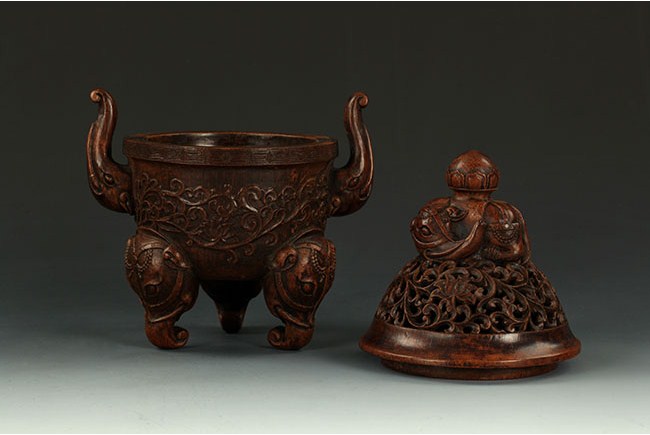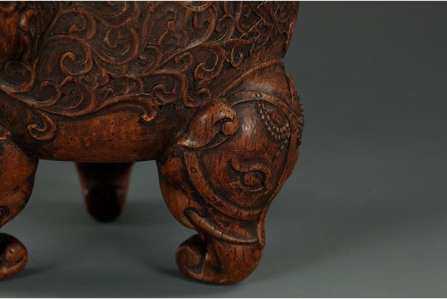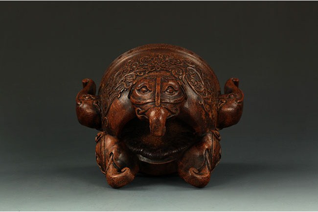 This well-carved bamboo censer has two handles and is themed with elephant heads. Various repeating pattern surrounds the censer to form a gorgeous design. W: 5 1/2 in (14cm), H: 9 in (23cm)