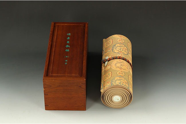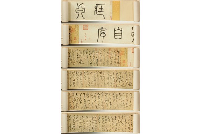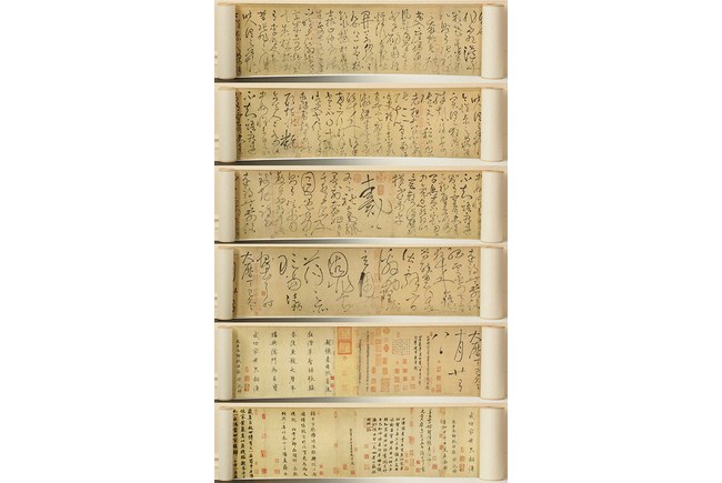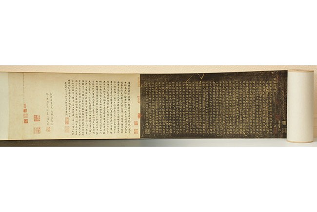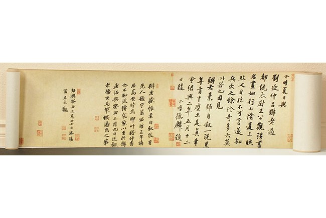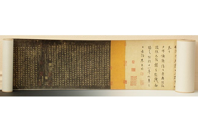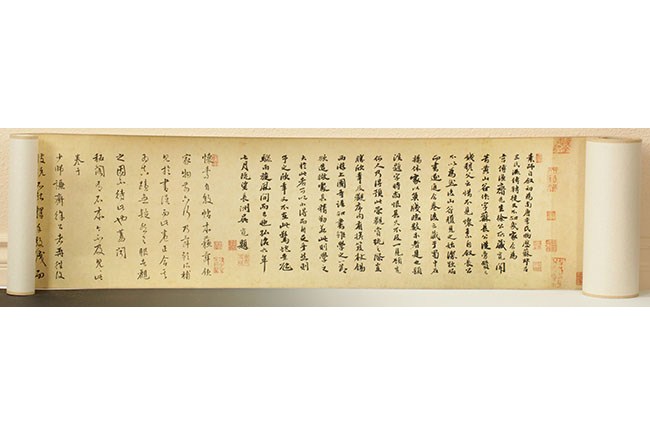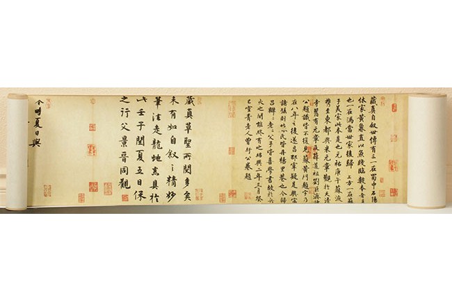 This beautifully written scroll of Chinese calligraphy expands five hundred and ninety-five inches wide and includes a collaboration of Chinese materials. L : 595 in (1511 cm) H: 11 1/2 in (30 cm)
