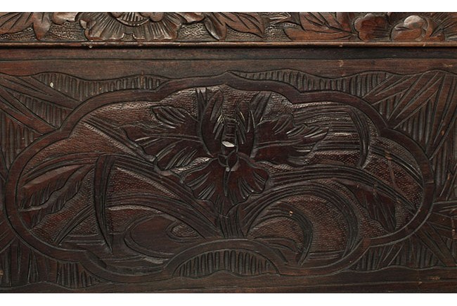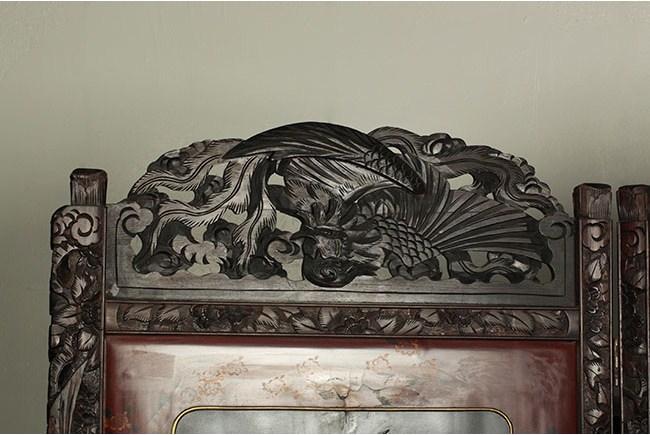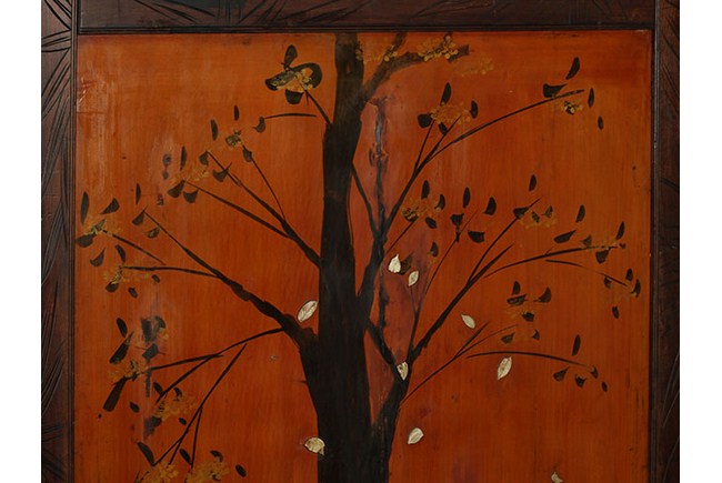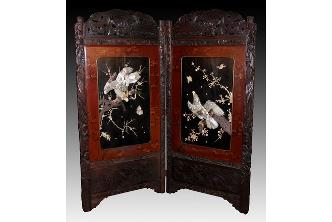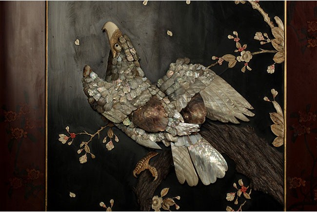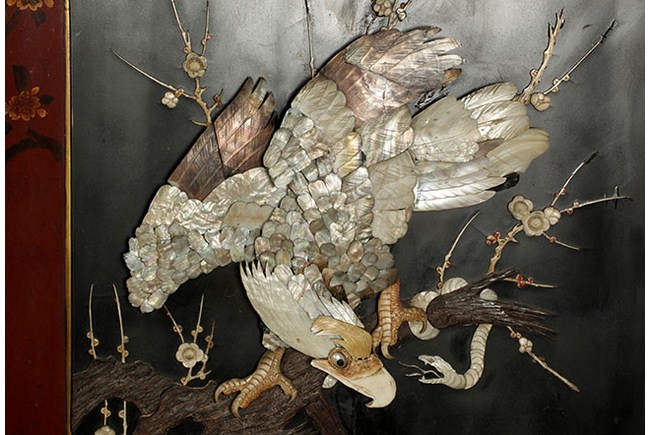 The large floor screen is composed of two separate floor screens linked in the center. The floor screen depicts two eagles, one on the branch staring down with a snake nearby, and the other on a lower branch staring up towards a bird. The scenes were created with mother of pearl, bone, wood, and other materials. The frames were low relief carved, with flowers, phoenix, and plants patterns. H: 75 1/2 in (192 cm), W: 67 1/2 in (172 cm)