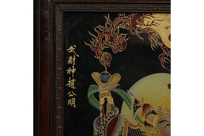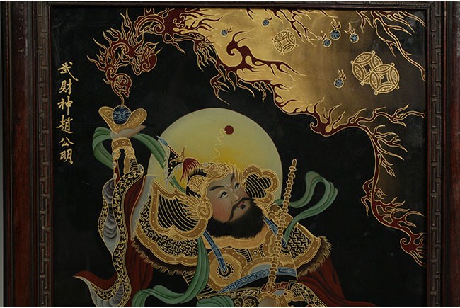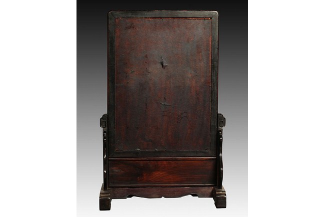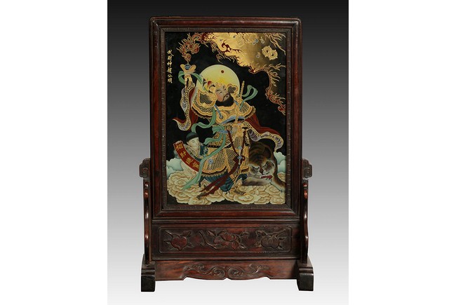 The table screen depicts the Chinese God of Prosperity bringing fortune. The colored glaze features beautiful and detailed colors, while the low relief carved hardwood frame and stand features delicate patterns. H: 30 in (76 cm), W: 19 in (48 cm)