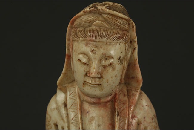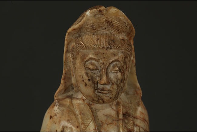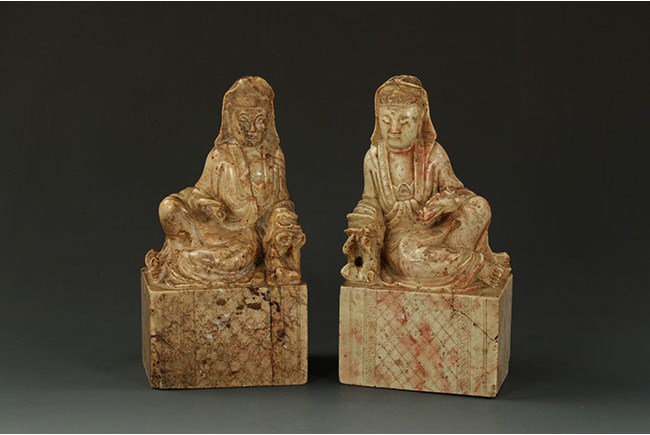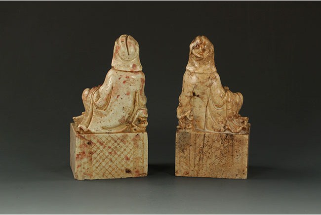 The two Guanyin have very similar posture, both seated slightly slanted, with one knee raised. The bottom is free of any Chinese characters or marks. W: 3 1/2 in (9 cm), H: 7 in (18 cm)