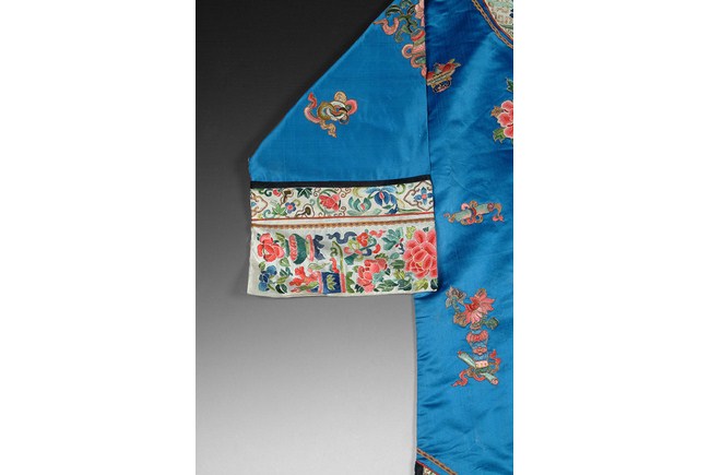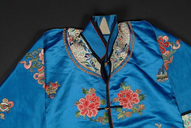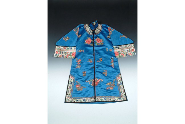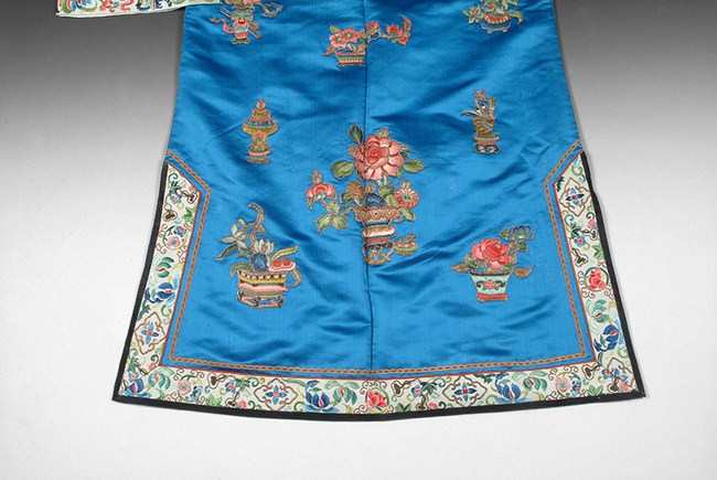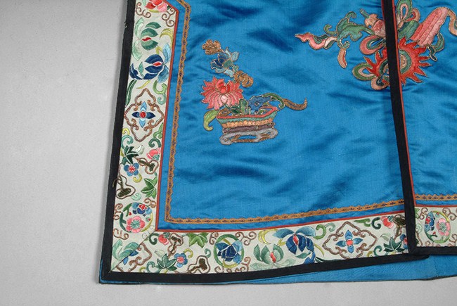 This well-sewed Chinese silk robe is blue in color with many flower decorated patterns scattered around. The inside of the robe is extremely smooth. W: 50 in (127cm), H: 38 1/2 in (98cm)
