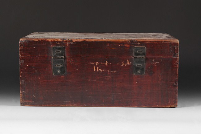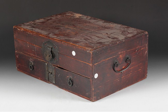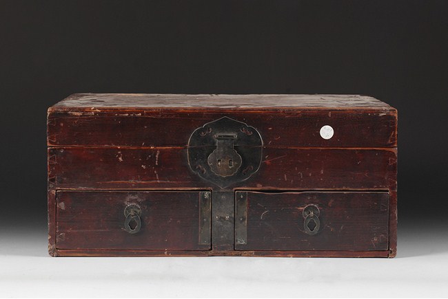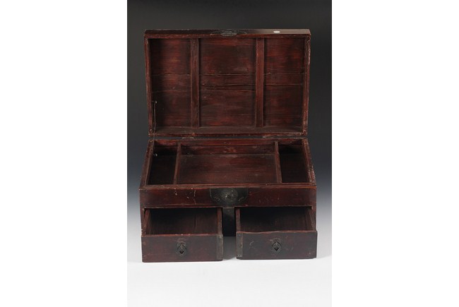 This wooden chest has two small drawers on the bottom and the top opens up with three sections inside. It uses bronze locks and handles. W: 13 in (33cm), L: 19 1/2 in (50cm), H: 8.25 (21cm)